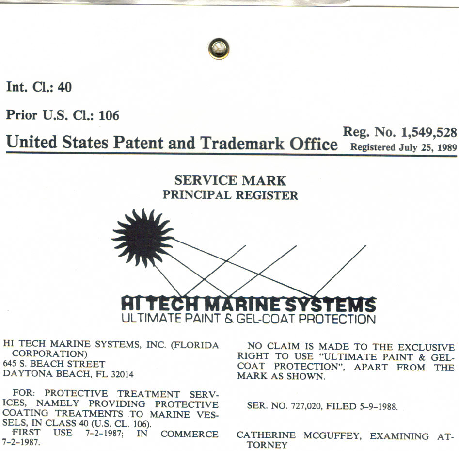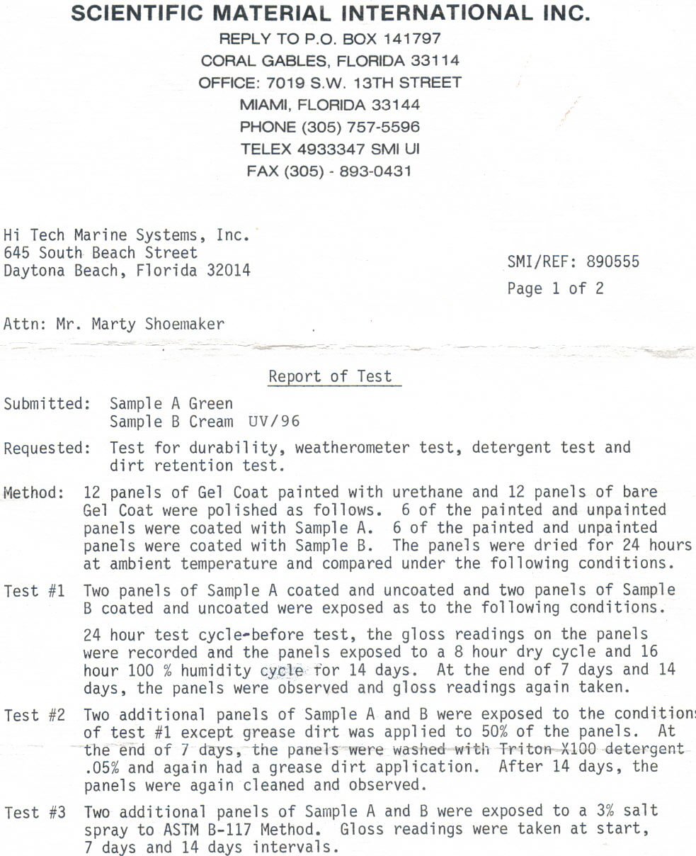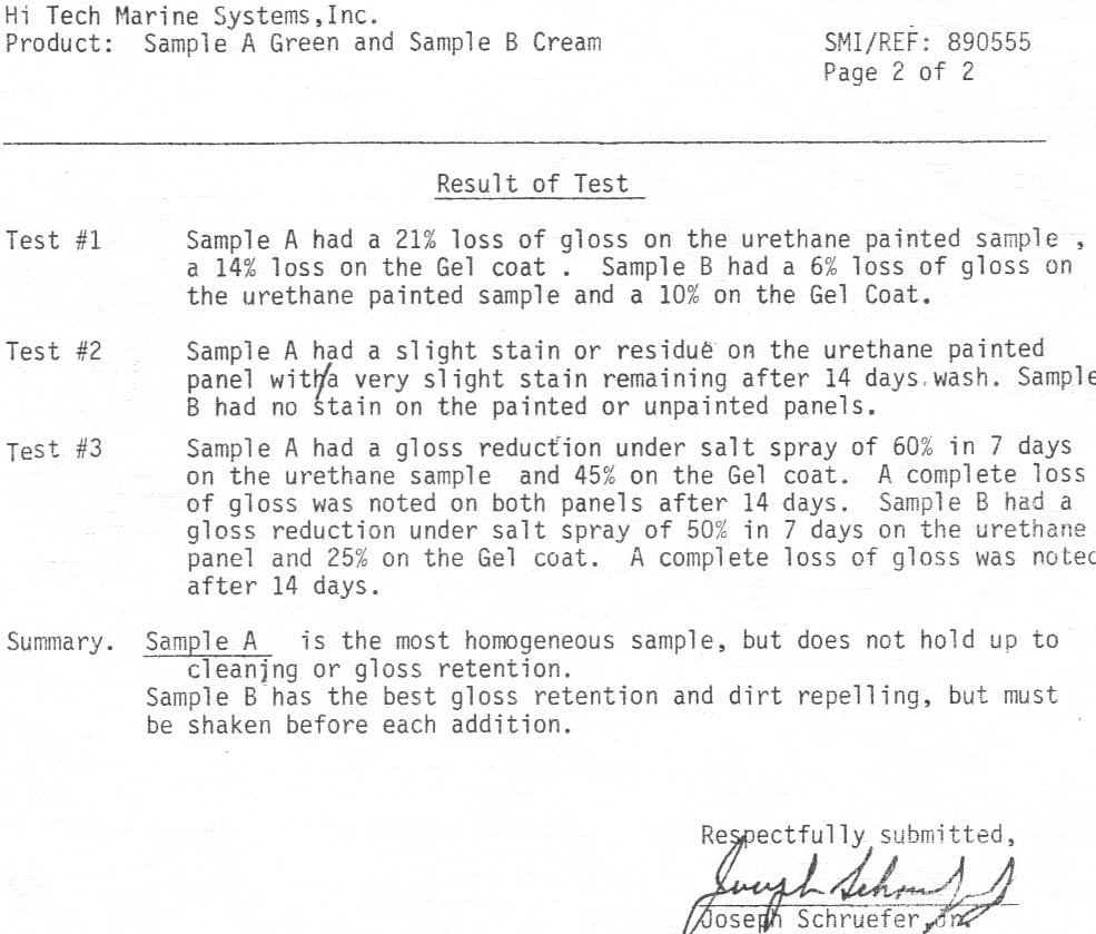 The Proof is in the pudding as they say. So here it is... the copies of the 20 year trademark and the chemical analysis of the UV/96 that proves it will outlast, outshine, and out protect any other wax, teflon, or polish in the industry today. Click each image to enlarge.
